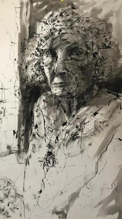 16 1/2" X 30" Ink, pastel Patrice is comforted by her medal of St. Padre Pio. She prays for her daughter's safety.